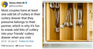 It all began when artist, illustrator and much else besides, the great Moose Allain, shared this ‘fun game’ of sneaking odd bits of cutlery into friends’ cutlery drawers when you visit (when you’re allowed to visit, obviously …)
