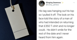 His tag was hanging out his top so I pulled it off. The look on his face told the story of a man of who had intended on returning that £350 T-shirt and no longer could. He didn’t smile for the rest of the date and I never heard from him again. https://t.co/oIOxay7m5S