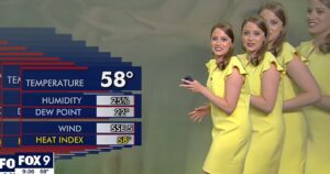 As Fox9’s Jennifer McDermed was in full flow delivering her weather forecast, a glitch caused a very psychedelic effect on screen, creating multiple Jennifers.