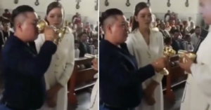 ‘My mom discovered this while volunteering to help on Sunday, after pouring the majority of a bottle into the eucharist cup, the priest had to finish off a half a bottle of wine himself.’