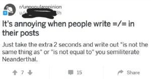 I hate it when people write “math” equations in juvenile abbreviated forms, uhh 1+1=2? No it should be a single one in addition to another single one is equal to the number commonly known as two. I mean how hard is that?