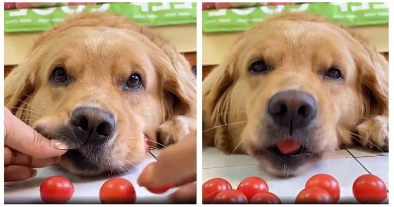 What could be more uplifting than a golden retriever with what looks like a Guinness World Record-breaking amount of cherry tomatoes in its mouth?