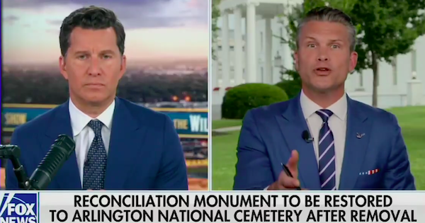 BREAKING: In an insane moment, Defense Secretary Pete Hegseth — head of the Pentagon — defends putting a Confederate monument in Arlington cemetery. “We recognize our history… we’re proud of our history.”