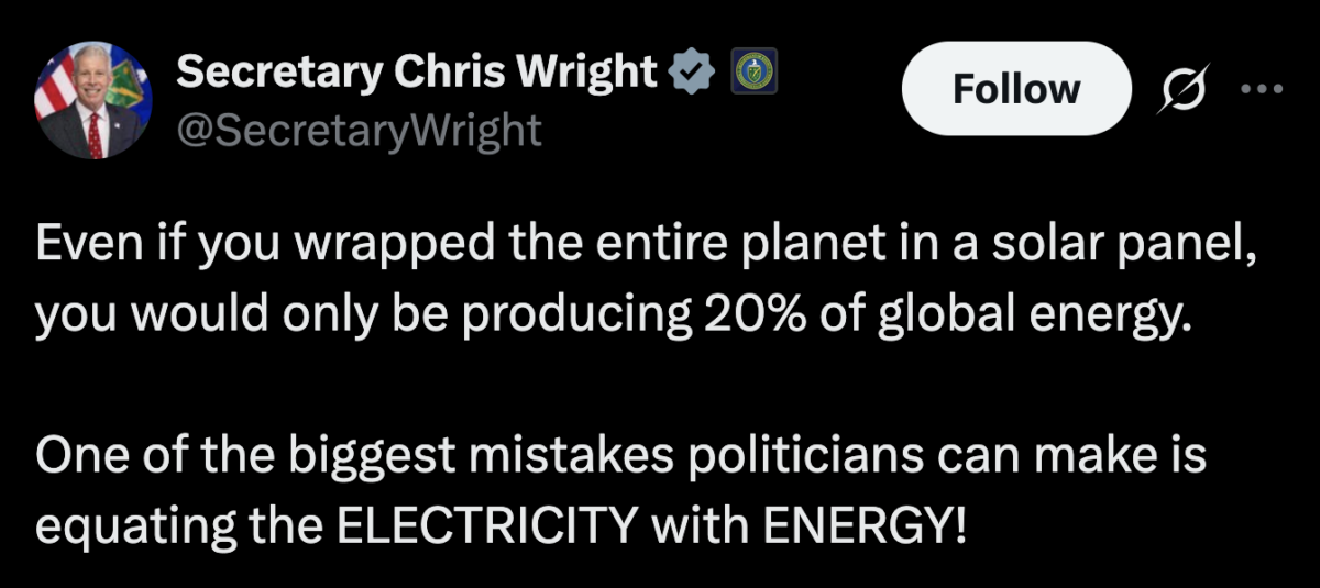 Secretary Wright’s claim seems off—wrapping Earth in 20% efficient solar panels would yield ~305 million TWh/year, about 1,700x global energy use (~172,000 TWh). As for payments, he’s a public official; previously, he founded Liberty Energy, an oil & gas firm. No evidence of…