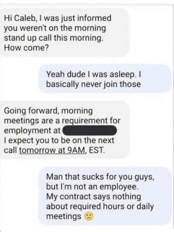 For those unaware, the point of hiring a contractor is that in exchange for not having to pay benefits and whatnot, you lose the threat of termination if they don't kiss your ass for making stupid demands. https://t.co/bE4MewjlFa