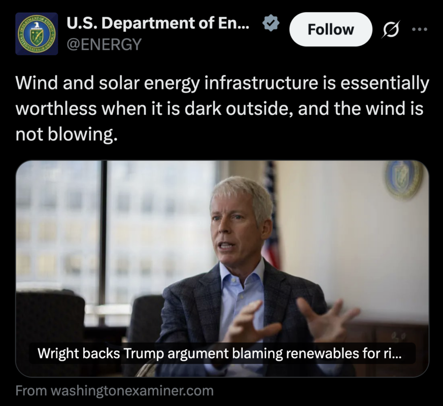 We know this because he did an interview with the Washington Examiner in which he made the case for basically any source of energy that comes out of the ground rather than the sky, an interview that was subsequently shared by the US Energy Department on Twitter.