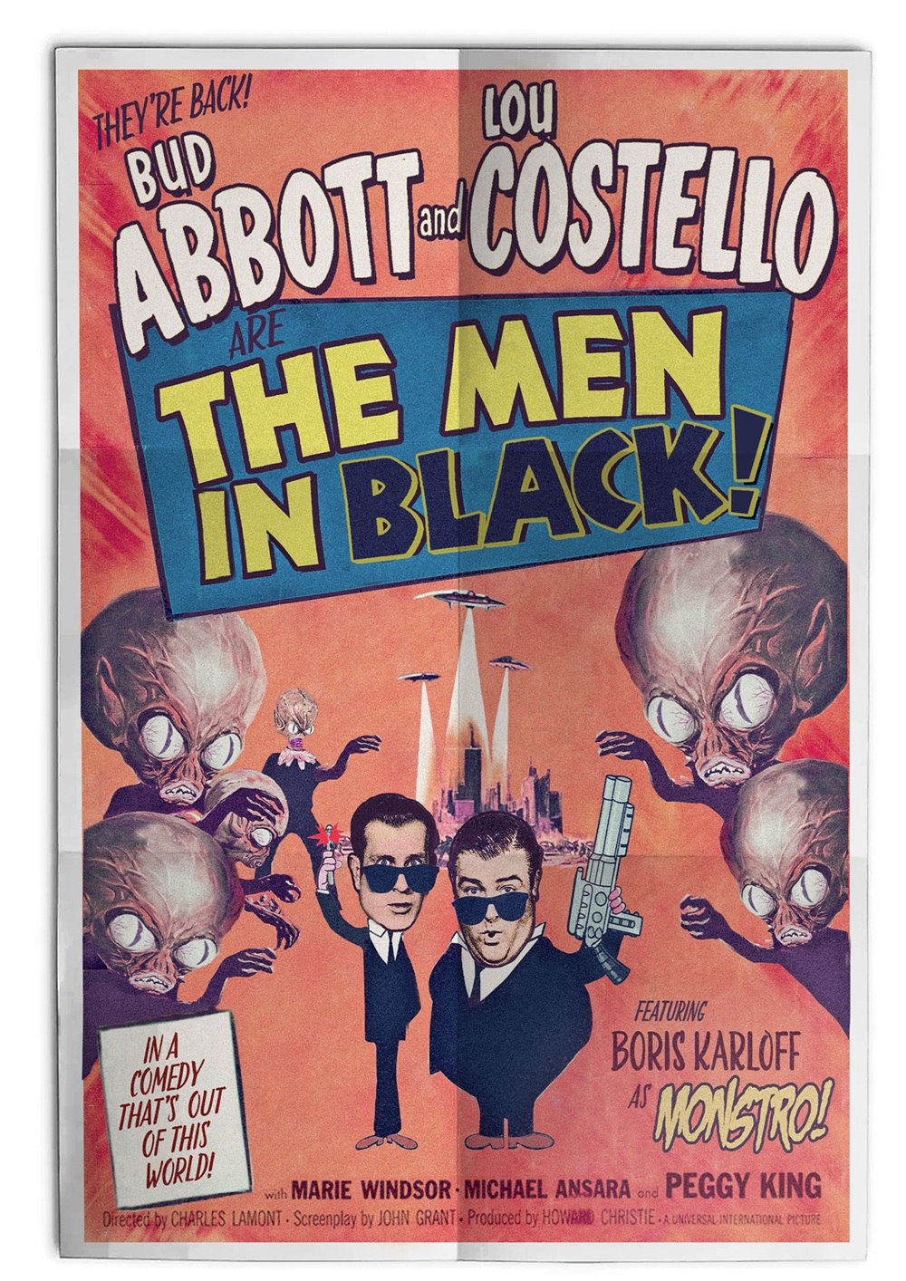 ‘Invaders from Planet X – led by Boris Karloff as “Monstro” take over the planet. Abbott and Costello are the only ones too dumb to be affected by their alien mind ray.’