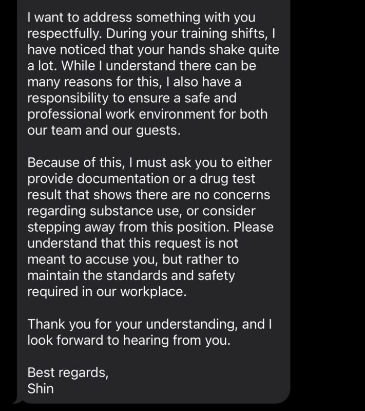 got accused of doing drugs on my second day of work just because i have a hand tremor i love working in a restaurant