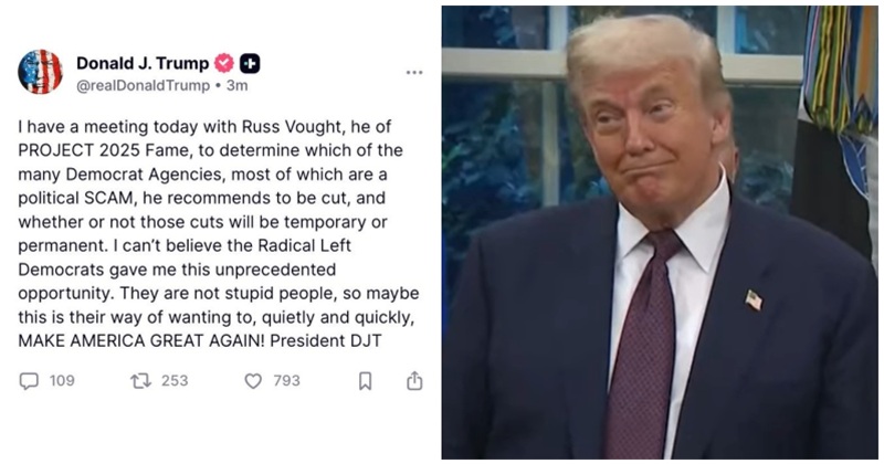 Trump: "I have a meeting today with Russ Vought, he of PROJECT 2025 Fame, to determine which of the many Democrat Agencies, most of which are a political SCAM, he recommends to be cut, and whether or not those cuts will be temporary or permanent. I can’t believe the Radical Left… pic.twitter.com/2thDe8FvIB