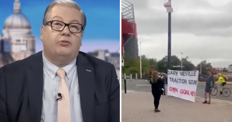 And one in particular – Talk Radio’s concrete-growing Mike Graham, took to Twitter to share the video of these protestors – angry, middle-aged white men, obviously – putting up flags in front of Neville’s hotel overlooking Old Trafford.