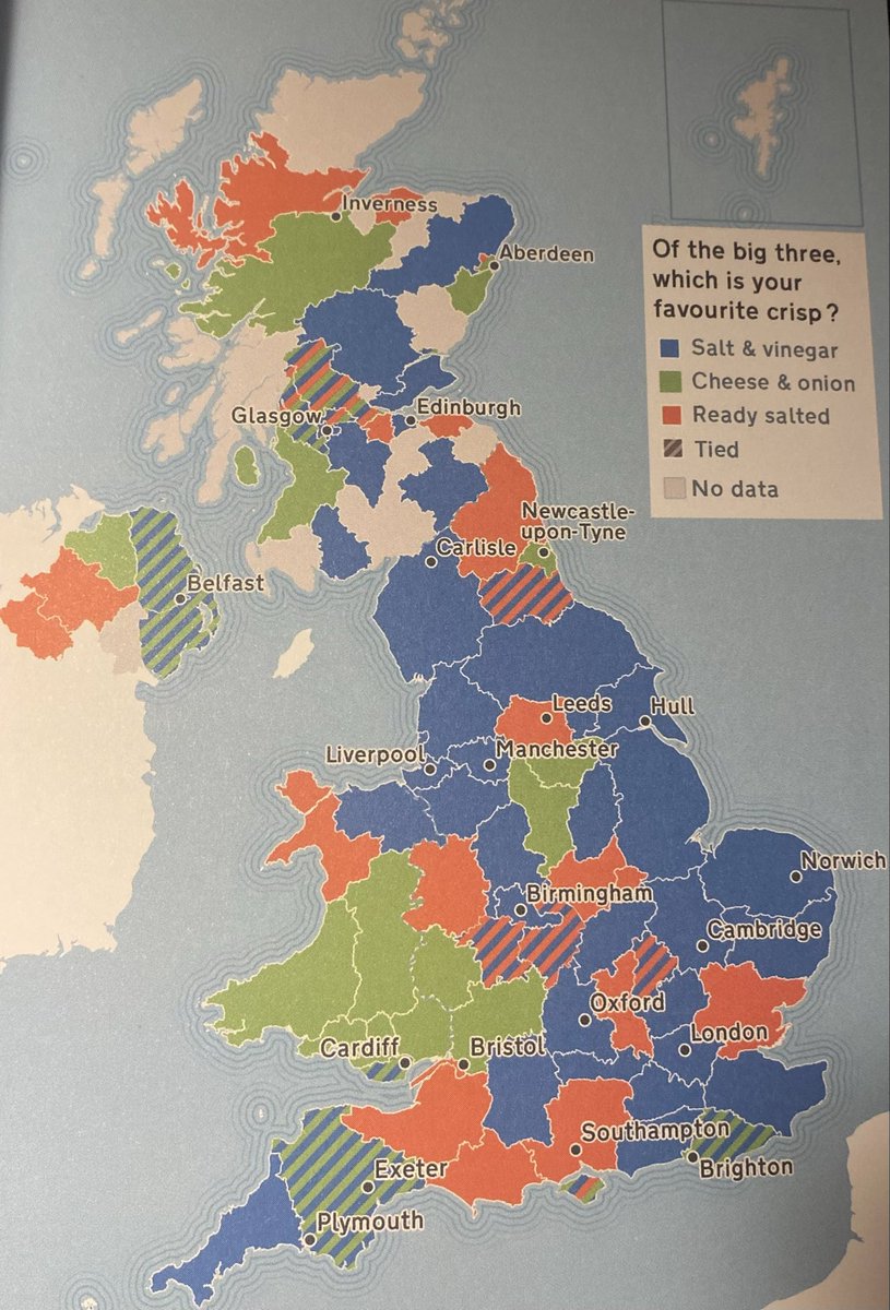 So it’s not a surprise that people get so passionate about their salty potato snacks, as you can see by the replies to this Tweet by Celia Richardson, Director of Communications at the National Trust. She shared a map from the National Trust book of Utterly British Maps, showing the preferred flavour of crisp for various regions of Britain.