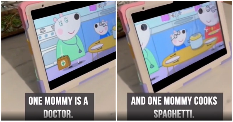 This Dad of the Year candidate is just casually filming his family dinner, which includes an iPad on the dinner table to appease the kid, when he stumbles upon the deep state’s propaganda wedged into an episode of Peppa Pig. The galling offense? Two moms in one family.