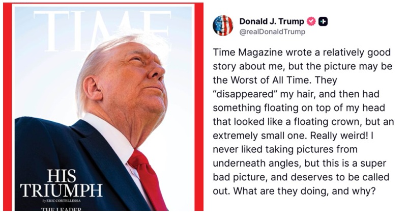 “Time Magazine wrote a relatively good story about me, but the picture may be the Worst of All Time. They “disappeared” my hair, and then had something floating on top of my head that looked like a floating crown, but an extremely… pic.twitter.com/ZqWgkgZfdX
