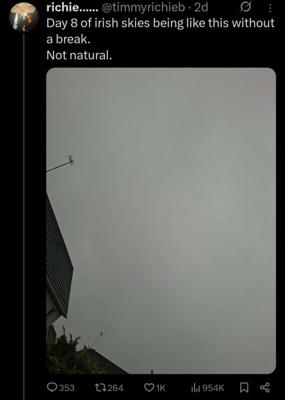 It’s a climate conspiracy theorist sharing their fears over the sate of the Irish sky over on Twitter, after it apparently looked like this for eight days running. Eight days, we tell you.