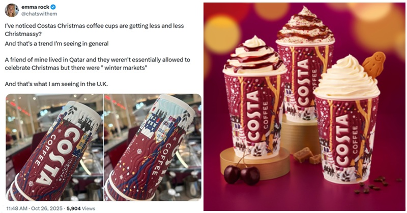 Over on Twitter, vaccine conspiracy theorist and purveyor of chemtrail nonsense Emma Rock has branched out into the ‘They’re coming for our Christmas traditions’ game with this scorching hot take on *checks notes* the level of Christmassiness of Costa’s disposable cups.