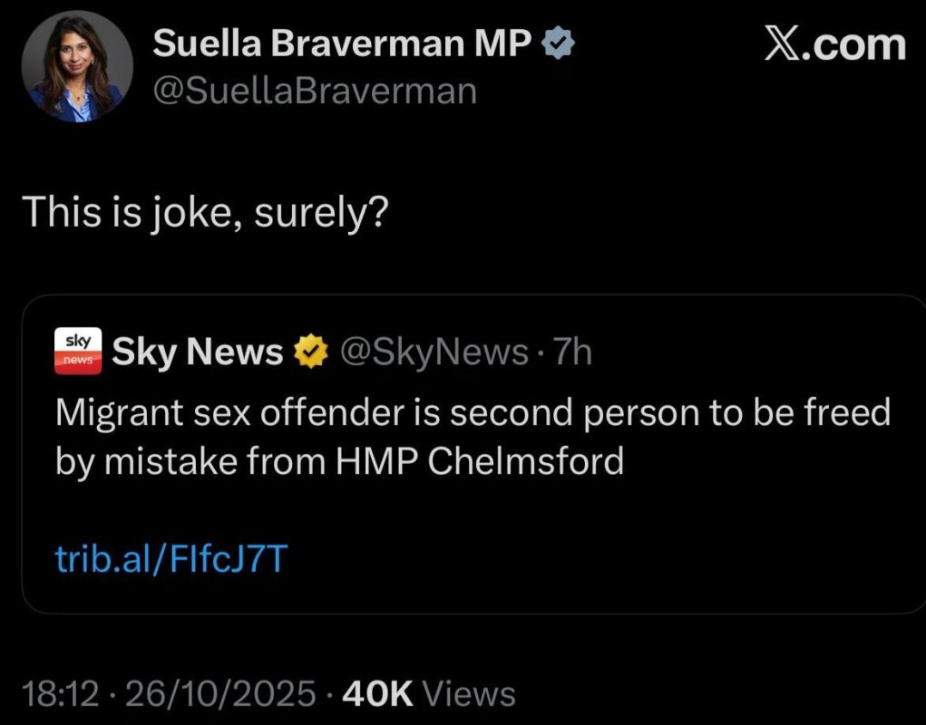 Braverman deleted this tweet which made me wonder who that previous prisoner was. His name was Junead Ahmed. He was a conman mistakenly released in 2023. She was Home Secretary at the time. Oh.https://t.co/hgeAHYYHxk pic.twitter.com/QYlv4bkA7e