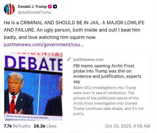 Not only is Trump still trying to blame everything on his predecessor, he’s bad-mouthing Biden any chance he gets. Trump recently ran to his own personal social media network, Truth Social, to respond to a news story about Arctic Frost, Joe Biden’s investigation into Trump’s attempt at overturning the 2020 election results.