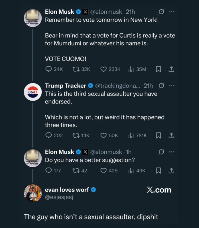 Mamdani is likely to prove a much fiercer and more effective critic to Donald Trump than so many of his Democratic colleagues, but we mention it again because of Elon Musk’s support for former governor (and now defeated) Andrew Cuomo.