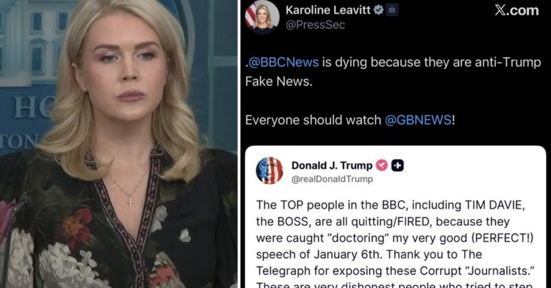 Donald Trump’s press secretary Karoline Leavitt was delighted to see the double resignation of the BBC’s director general Tim Davie and the corporation’s head of news, Deborah Turness.