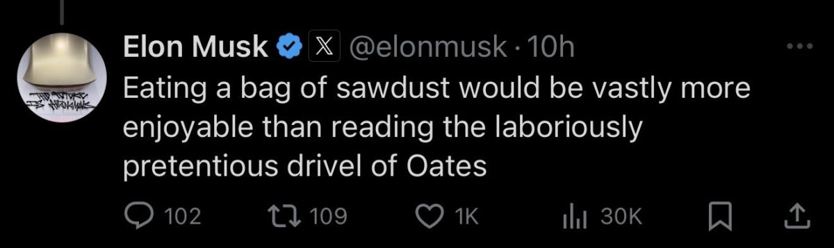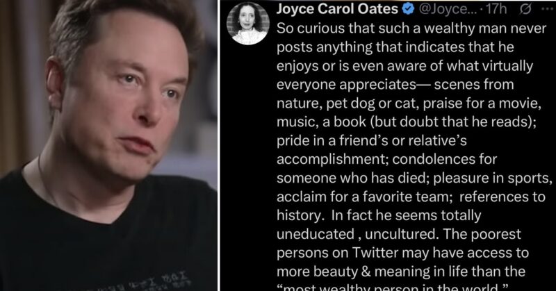 It’s a post by veteran American author Joyce Carol Oates offering up a especially devastating critique of the Tesla man which went wildly viral on Twitter for reasons which will presumably become obvious.