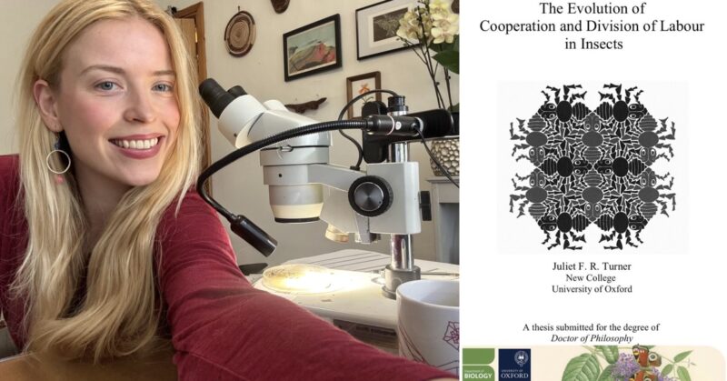 Just in case that’s tricky to read, Juliet Turner studied the ‘evolution of cooperation and division of labour in insects’.