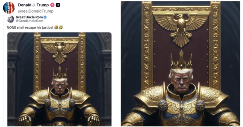 In his latest unhinged AI depiction of himself, he appeared like some type of Warhammer emperor, complete with a disturbing symbol above his head.