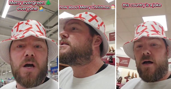 This guy in an England flag hat got very upset in his local Tesco about “Evergreen Trees” and was heckled all the way to the North Pole