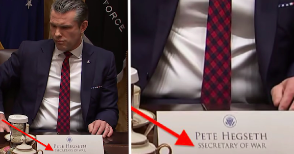 Pete Hegseth's nameplate during today's cabinet meeting featured an unfortunate error.