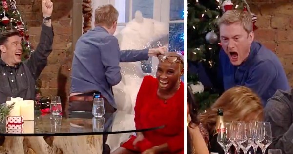 And when the vote went in favour of tapas, James went into a fake outrage, flipping a Christmas wreath from the table in front of him, shaking the Christmas tree, and, most memorably, punching a decorative polar bear behind him.