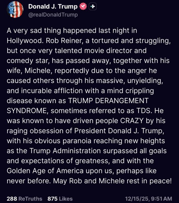 But we’re not sure he’s ever set the bar quite so low as this, after he took to social media to attack the beloved Hollywood director Rob Reiner and his wife Michele just hours after they were found dead in their home, victims of an apparent homicide.