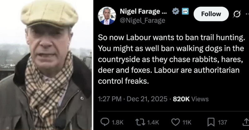 That’s right, the Reform UK leader is up in arms that Labour is planning to put trail hunting as part of its new animal welfare strategy.