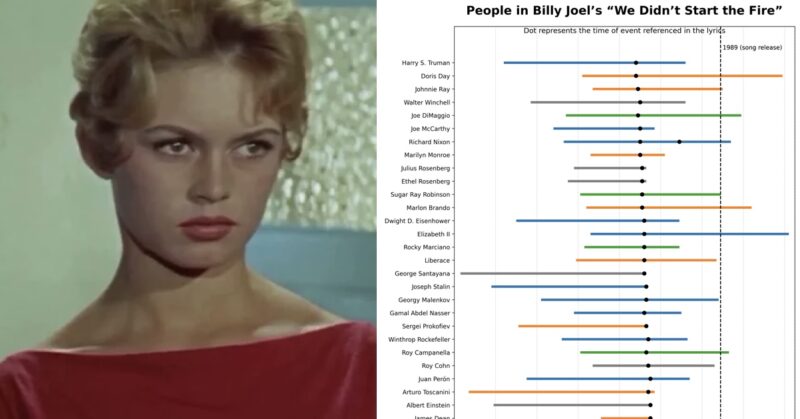 The death of Brigitte Bardot necessitated the update of this marvelous chart. Only three people mentioned in Billy Joel’s banger “We Didn’t Start The Fire” are still alive. Source: https://t.co/RQytWpRj03 pic.twitter.com/mBtFG5Ra8O
