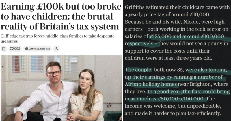 Matthew and Nicole Griffiths apparently earn a combined £225,000 a year which is by their account not enough to pay for bringing up kids, having totted up (hypothetically, presumably) ‘£40,000 in childcare bills’.
