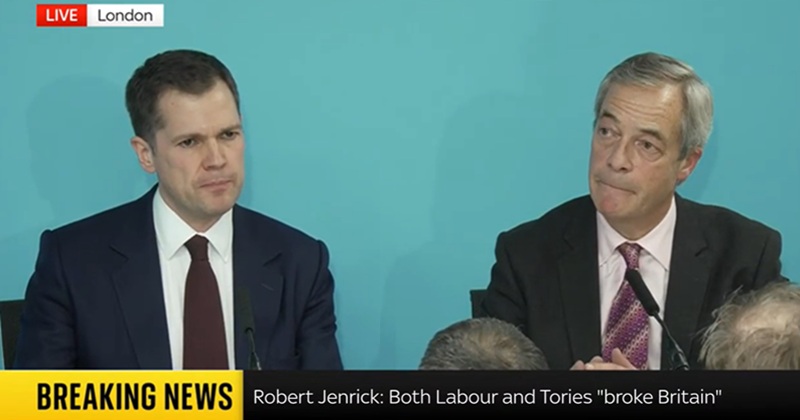 Nigel Farage is currently unveiling Robert Jenrick as a defector at his 430 press conference.