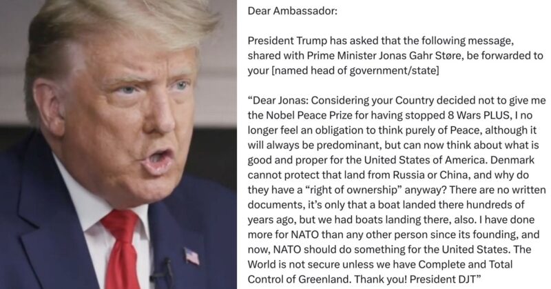 This isn’t satire. No jokes. This is the President of the United States telling Norway that he’s going to take Greenland from Denmark because Norway didn’t give him a peace prize.