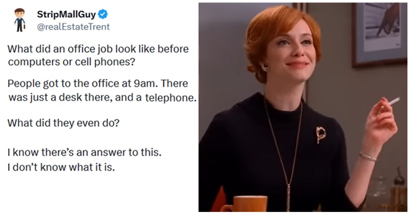 Over on Twitter, user StripMallGuy has asked his followers what people actually did in offices before computers and mobile phones, apparently imagining an entire workforce staring silently at a beige desk until it was time to go home.