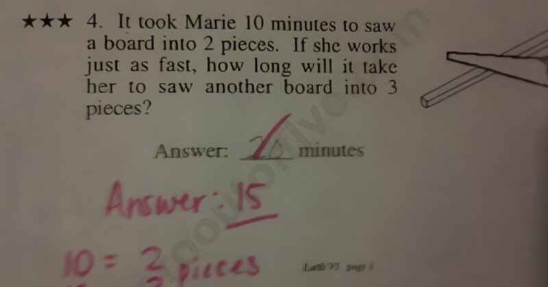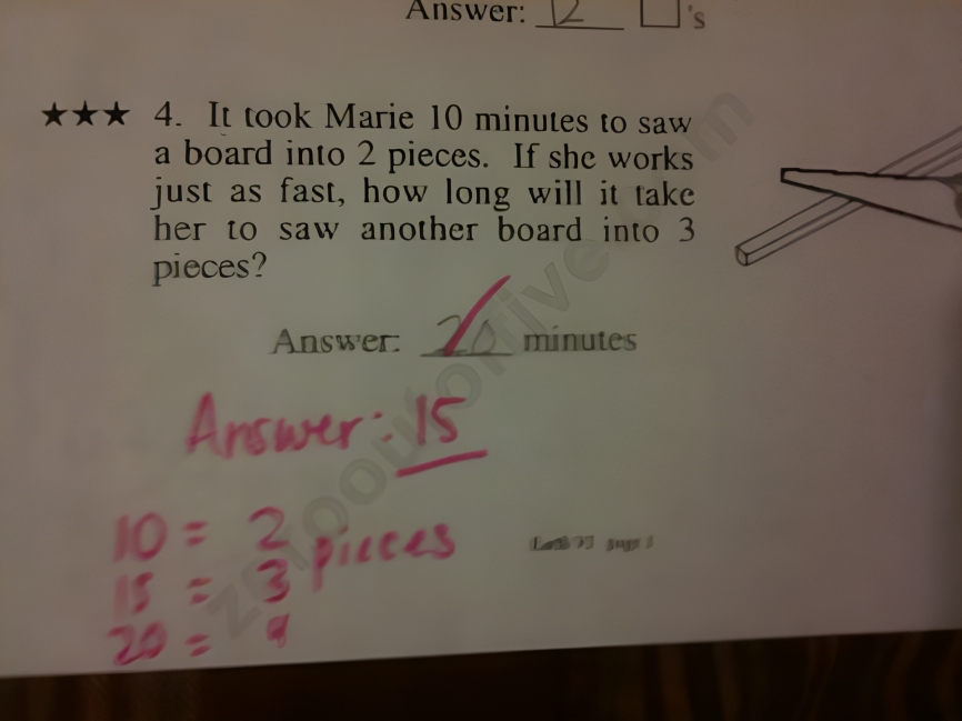 then TWO cuts is ____________I can see how this worksheet creator gets mixed up — if it were phrased as something like “It takes 10 minutes to make two drawings by hand. How long would it take to make 3 equivalent drawings in the same manner?”…