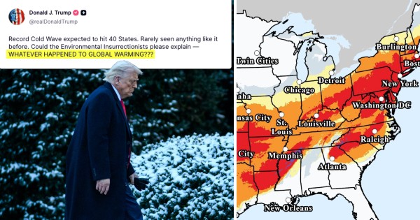 "Record Cold Wave expected to hit 40 States. Rarely seen anything like it before. Could the Environmental Insurrectionists please explain — WHATEVER HAPPENED TO GLOBAL WARMING???" – PRESIDENT DONALD J. TRUMP🇺🇸 pic.twitter.com/aMTrntZc6H