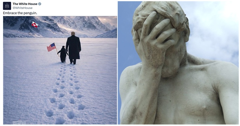 The official Twitter account of The White House added a little more fuel to the fire by posting an AI pic of Trump in a snowy landscape walking towards a Greenland flag. He’s depicted as being hand-in-flipper with a… PENGUIN, which holds a USA flag in its free flipper.