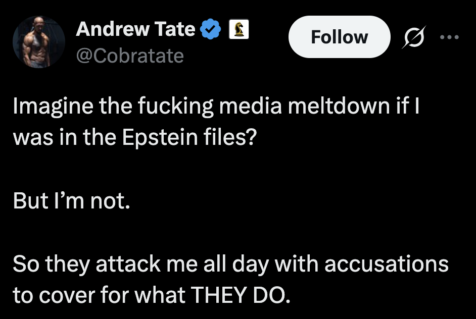 With the release of the latest batch of Epstein files putting people on both sides of the Atlantic under the fiercest of spotlights (we’re looking at you, Peter Mandelson), the clown prince of the toxic manosophere thought he’d take the opportunity to big up his absence from all the published documents to date.