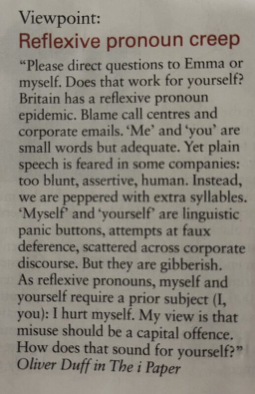Here’s a rather fabulous rant against ‘reflexive pronoun creep’ which has just gone wildly viral for reasons which will be obvious to anyone who’s ever watched The Traitors (or no end of other reality shows, no doubt).