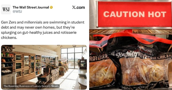 “Gen Zers and millennials are swimming in student debt and may never own homes, but they’re splurging on gut-healthy juices and rotisserie chickens,” the piece said.