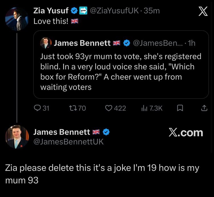 Just took 93yr mum to vote, she’s registered blind. In a very loud voice she said, “Which box for Reform?” A cheer went up from waiting voters