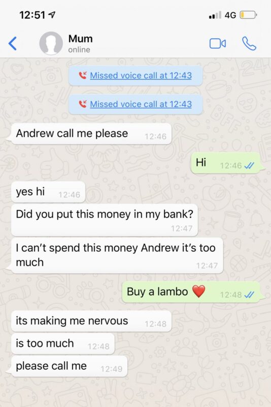 Specifically, he shared this screenshot in which his mother was literally overwhelmed by his generosity in whatever the opposite of a humblebrag is.