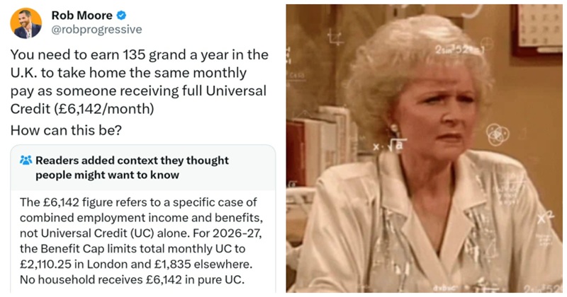 You need to have an IQ of -1 to claim that you need to earn 135 grand a year in the U.K. to take home the same monthly pay as someone receiving full Universal Credit (£6,142/month).