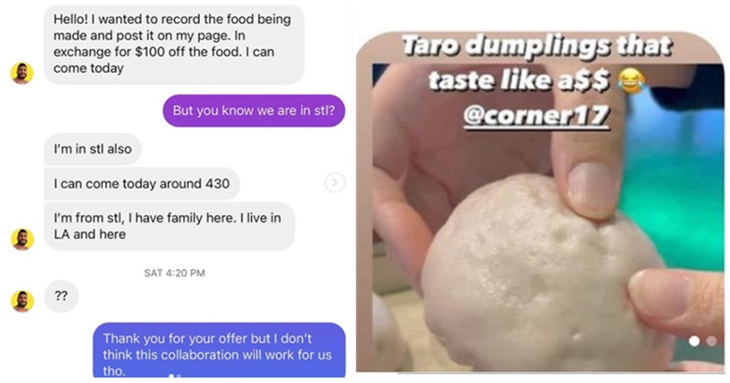 One of them, Antonio Malik, @antonio_eats_la, sent a message to Corner 17 in St. Louis, trying to get a $100 discount, and this is how that panned out.