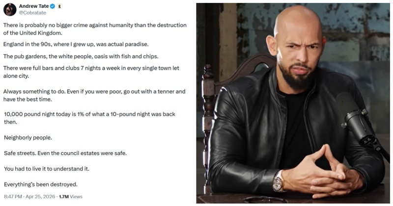 We cross now to the manosphere, where we find Andrew Tate once again crying about how bad the UK is. In this episode of Tate’s Tantrums, it’s the decline in a night out that had the purveyor of racist, sexist BS throwing his toys out of the pram.