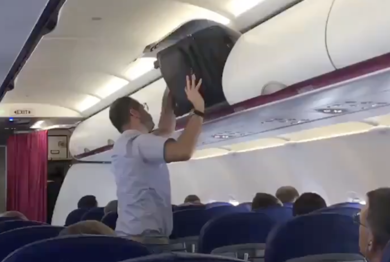 Spare a thought – kind of – for this airline passenger who’s attempt to stick his bag in the overhead locker just went wildly viral on Twitter.